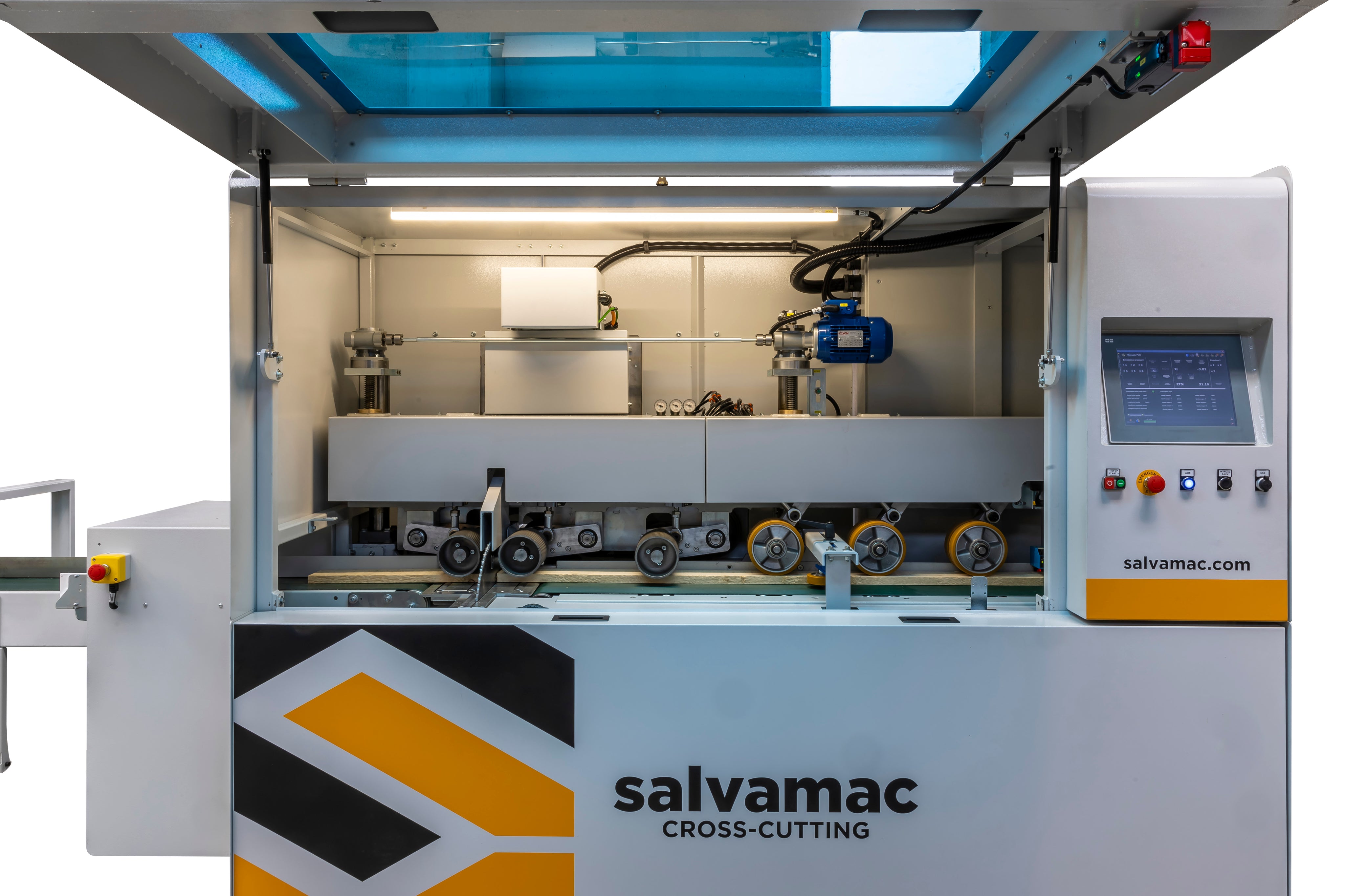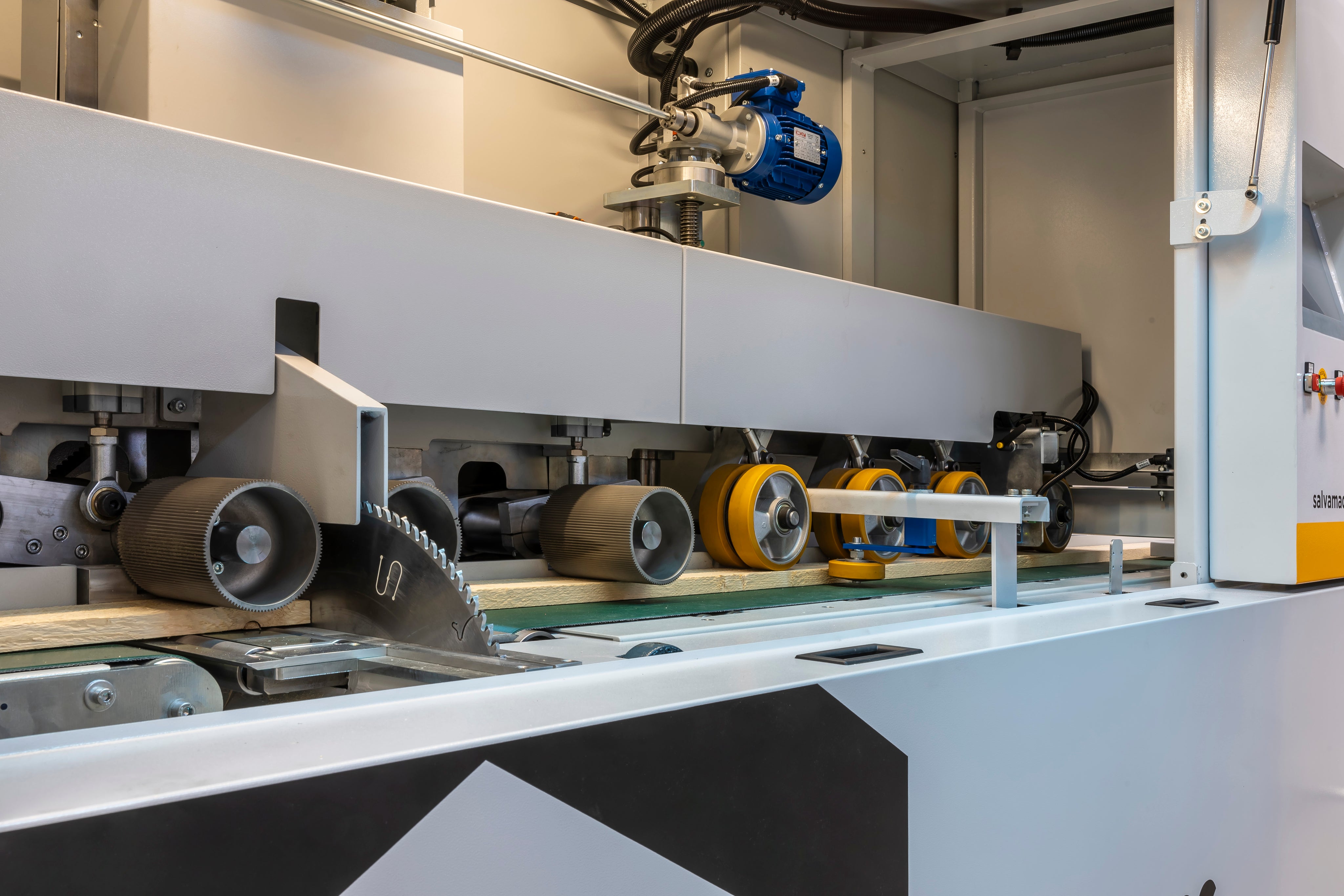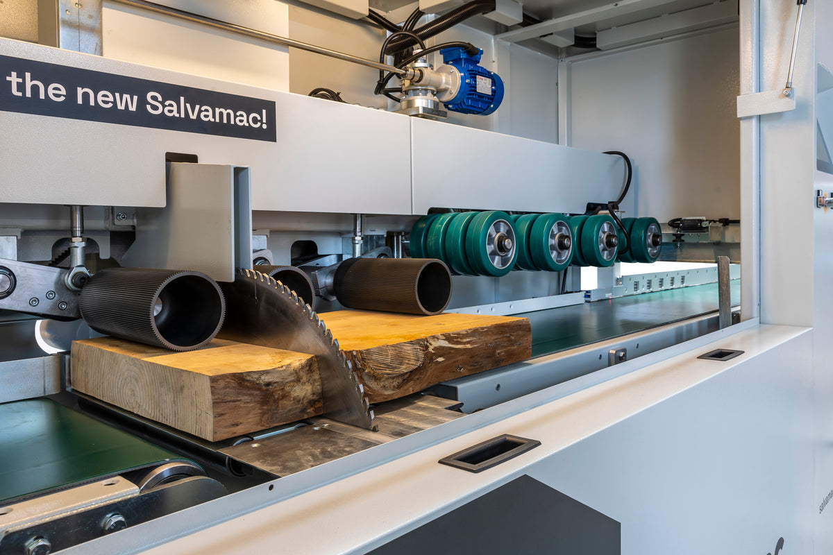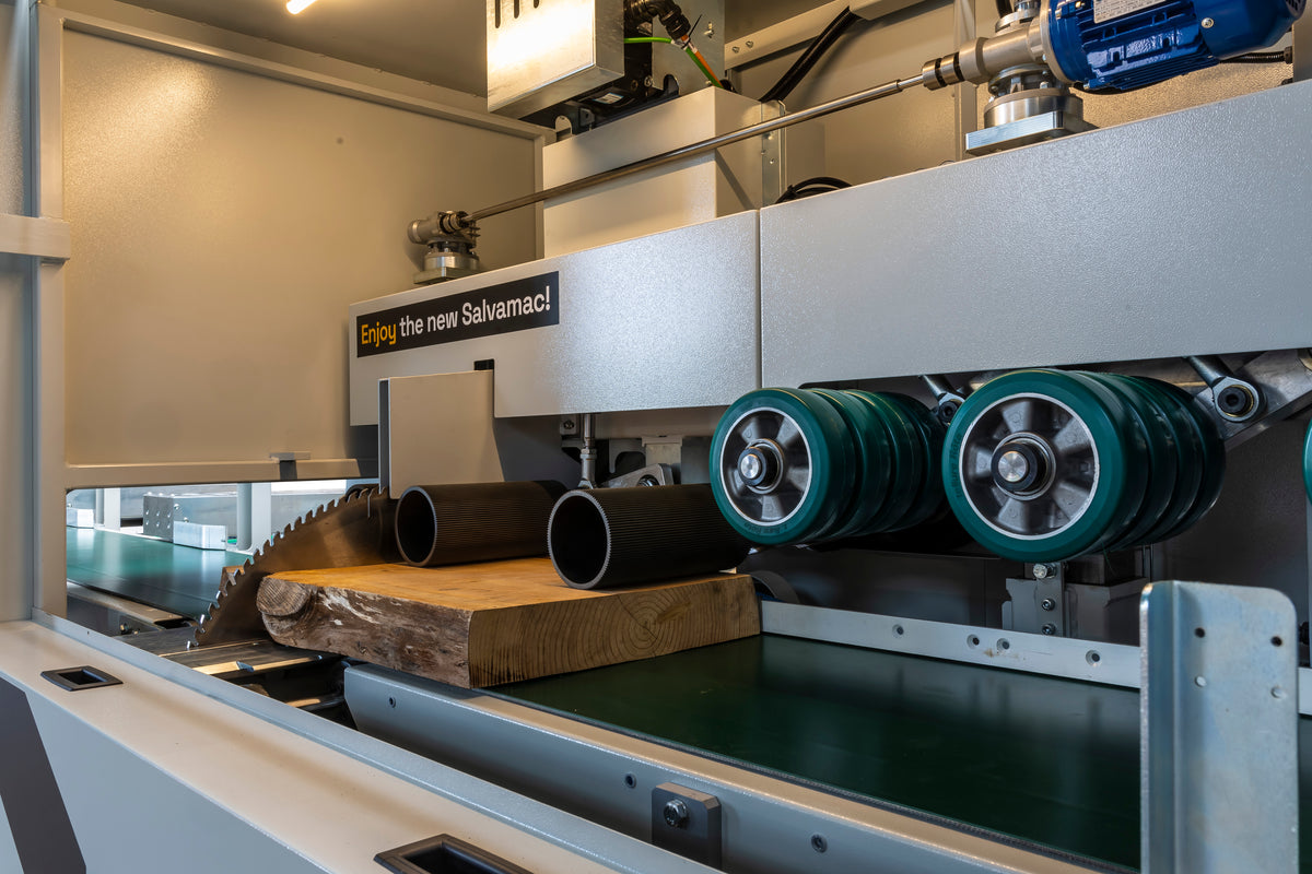 SalvaCut is an innovative high-speed optimizing saw designed for the optimization and elimination of wood defects. It features double traction with upper rollers and a lower feed belt with independent management. The two independent and interconnected Brushless feeding motors are engineered for faster accelerations and greater precision.